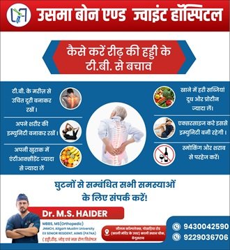 Welcome to Usma Bone & Joint Hospital, Begusarai Your Trusted Center for Complete Orthopedic & Joint Pain Solutions Located near Kali Sthan, Begusarai, Usma Bone & Joint Hospital led by Dr. M.S. Haider (MS Orthopedic, AIIMS Patna), offers world-class treatment for bone, spine, and joint-related problems. Whether it's knee pain, joint stiffness, arthritis, fractures, or sports injuries, we provide advanced and affordable care. At Usma Bone & Joint Hospital, your health is our priority. From compassionate personal care to cutting-edge orthopedic treatment, we ensure every step toward recovery is smooth, safe, and effective.